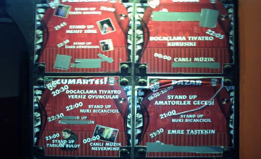 WHATS THE DEAL WITH GOZLEME? I LIKED IT BETTER THE FIRST TIME WHEN IT WAS CALLED KESCEDILKE On a saturday night, one month into our Second City contract aboard the Norwegian Jade, we docked in the only city in the world that sits on both Europe and Asia; Istanbul, Turkey. I had heard about a turkish comedy club that sat off the main drag of a hip little area of Turkish night life known as Taxim Square. After a night of Effes beers and strawberry hookahs, I convinced fellow Second City cast mate Dean Evans into going with me to check out the local comedy scene. Old City Comedy Club was it's name. Why it's name was in english I still don't know. We walked up a side street and through a doorway that sat in between a dozen posters boasting of Turkish comedy shows scheduled throughout the week. We bought two tickets from the box office attendant who didn't understand why two english speaking tourists wanted to see an all turkish show. While the rest of the week is stand-up, Saturdays at midnight they had improv at the club. A troop of seven actors were performing short form improv comedy. Although completely in turkish, they played the same improv games as we do back in Chicago. While Dean and I were generally at a lost of what was going on in a scene, every now and then we could at least get a sense of why something was funny. They played a game called 'blind line' where just like in the states, the improvisers' lines are made up of what's written on pieces of paper strewn across the floor. And just like in the states the audience laughs, because what's written on the paper was their idea. At the end of the night Dean and I joke about how funny it would be if I tried to get booked as a stand-up in the club. It seemed like a ridiculous, horrible idea. I had to give it a shot. I met a guy who worked there named Haasan who spoke a little bit of english. I told him I did stand-up in the states and wanted to know if I could perform at one of their shows. "But people here don't speak english." "Well, I think that I would learn some Turkish, and maybe do bits set to music where I don't speak." He said he would talk to his boss for me and we exchanged e-mails. After a month of cruising the Mediterranean, we were back in Istanbul. Hassan never got back to me, so I returned to the club for another attempt at launching my Turkish comedy career. Although this time when I arrived nobody was at the box office. I walked upstairs to find the club, unlit and empty. Empty, not counting the eight guys on the far side of the room standing around a movie camera aimed out the window, pointing at the street filled with people below. I bump a chair in the dark room and eight startled Turks turn to see who just walked in their obviously closed club. I tried to act as if I was just one of the guys. "Hey, what's up dudes? Is Hassan around?" The most intimidating of the Turkish camera crew took a long drag of his cigarette and responded with, "Why you want Hassan?" I give the long explanation of my stand-up background, how I've been performing on an international cruise ship for audiences from all over the world with Second City, and how I had talked to Hassan about doing stand-up at Old City. Eventually he slowly put out his cigarette, handed me a card, said the turkish words for, "e-mail me". He then walked back to check on the rest of his crew who were still silently smoking and video taping unknowing pedestrians from above. Why they were video taping people, I also still dont know. After enough time in Turkey you grow to accept that most of the time you are there, you won't understand what's going on. The smoking man was the boss and the boss's name was Ali Bibber, as his hotmail account dictated. Ali also never returned any of my e-mails over the course of the next month. Once in Istanbul for the final time of our contract, I made my last ditch effort for the chance to possibly get booed off the stage in a whole new continent I've never been booed off the stage in before. Again I walked through the front door of Old City. A waiter, Yahmas, who spoke a small amount of english recognized me and welcomed me in. I asked if Ali was around. He said, "No, Football, March!!' Under the assumption that he meant that the booker of the club was playing soccer for the next six months, I asked Yahmas if I could perform stand-up at his club. He didn't seem to understand. I then began to mime doing stand-up with a microphone. He then pointed at me and said, "You?" and then did a slight impression of my stand-up miming. "Yes! Yes I want to do comedy here." We made up our own form of sign language to communicate with each other. It ended with him telling me to come back the following night at seven, where, as best as I could tell, he was going to let me go up and perform. I said thanks and told him I would see him tomorrow at seven. He shook my hand and with a big smile said, "Barrack Obama!!" Which is turkish for "Barrack Obama!!" As far as I understood, I was now booked at the Turkish comedy club. The hard part was over. All I had to do now, was learn Turkish. During my initial trip to Istanbul I bought a 'Learning Turkish' Book. It was made up of standard greetings and pleasantries. But unless I was going to do jokes consisting of listing the days of the week or naming different kinds of vegetables, I was going to have to seek elsewhere for my turkish vocabulary. The next day I dropped by a local coffee bar I frequented on previous trips. The bartender was excited to see me, it was as if he had never recognized anyone before. He was happy to help me out and one thick turkish coffee later I had notebook page full of turkish phrases. Since every word in the turkish language contains either an umlaut or a dollar sign, he phonetically wrote all my words out. I bid my bartender Mahaba, and I spent the rest of the day memorizing my new turkish act . At seven I was back at the club and ready for my Istanbul debut. Yemas was there. I to
